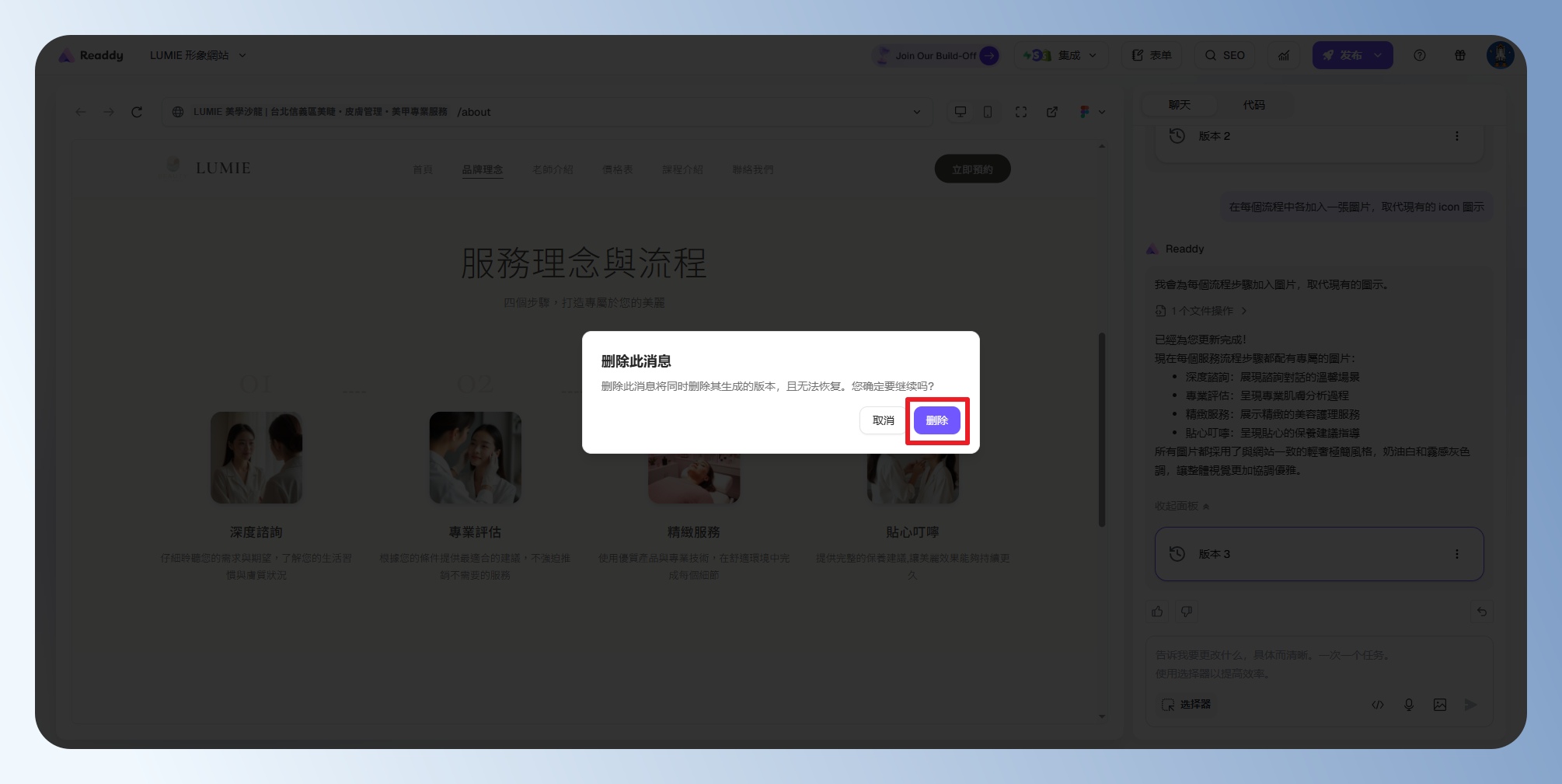 如果 AI 生成的效果不符合需求,可以點擊右側聊天紀錄中的版本號,再點選「刪除版本」。