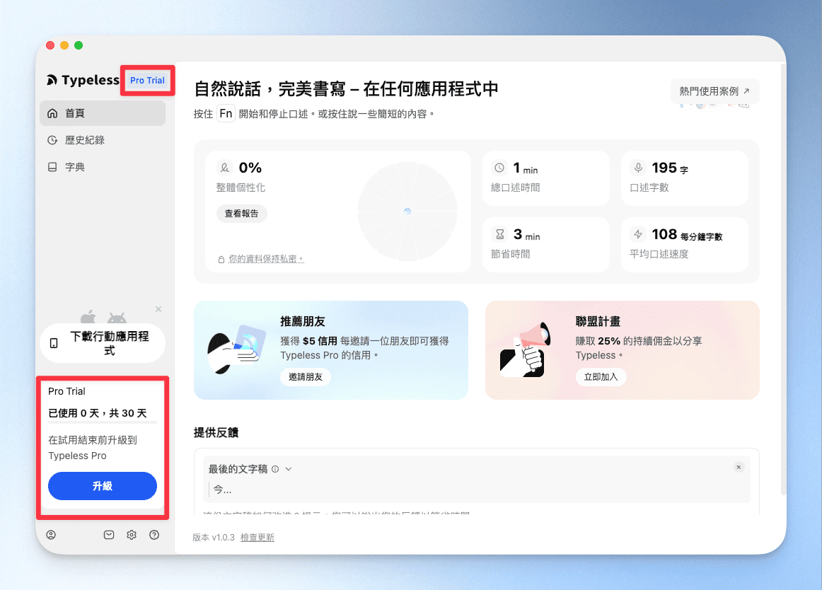 Typeless 的免費版和 Pro 付費版,在個人使用上最大差別是「字數額度」。