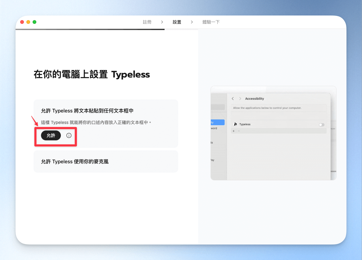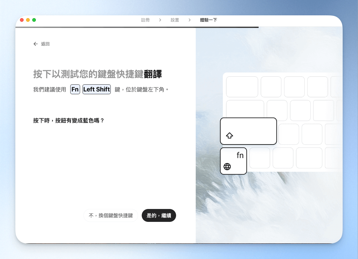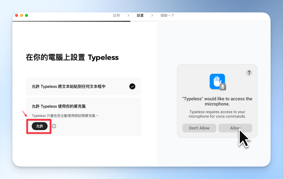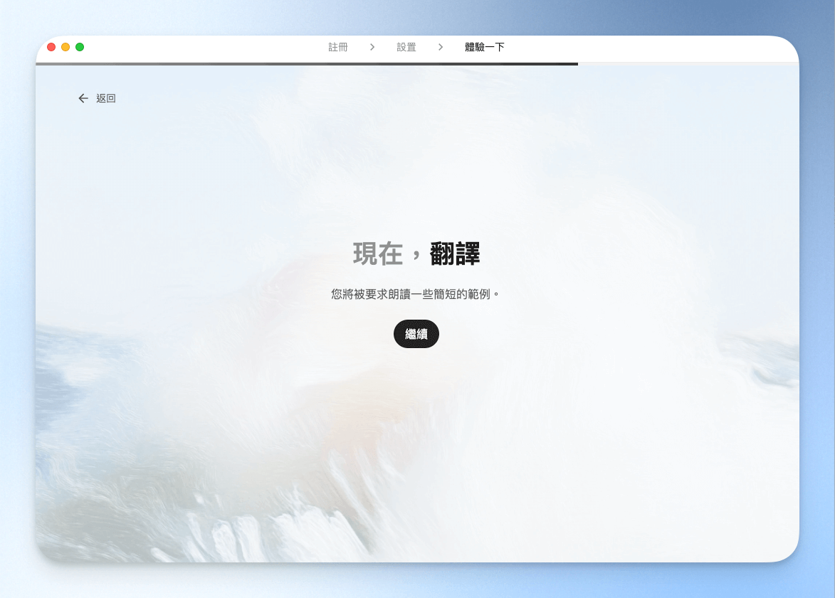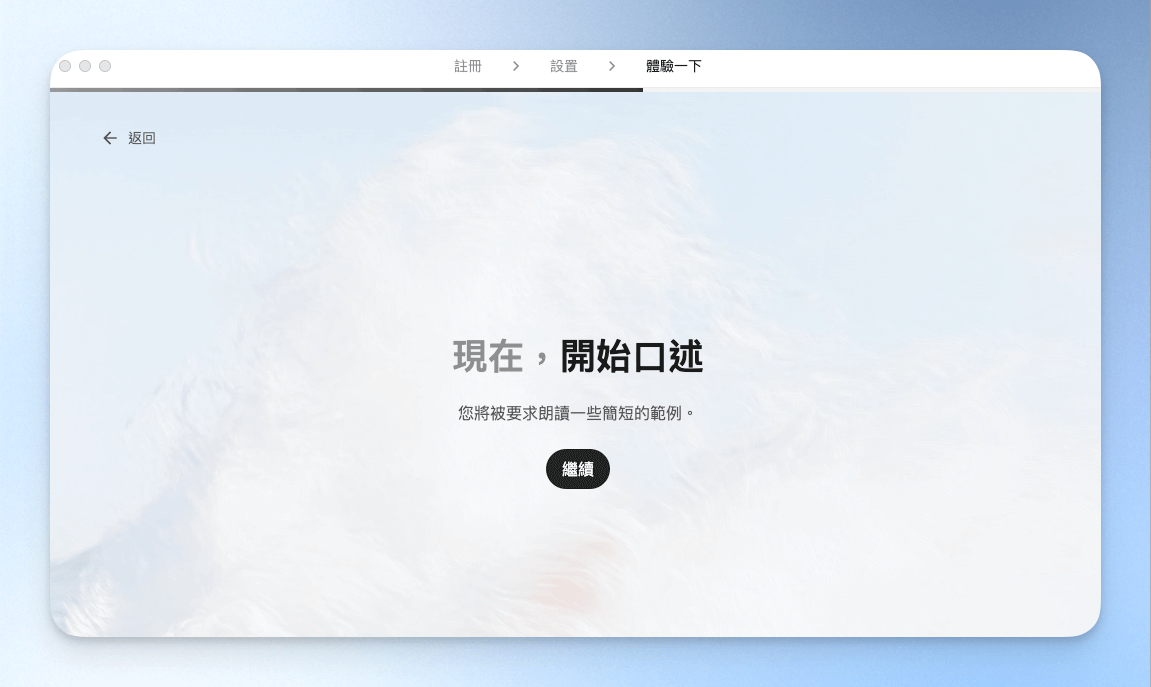 進入官方流程體驗,熟悉Typeless基本操作。Typeless預設是簡體中文,所以接下來輸入的文字都會是簡體字,但只要在正式開始使用前,完成設定就沒問題了!第一部分:口述,按照指示進行操作跟測試就可以囉,也附上我體驗時的影片,給你參考~