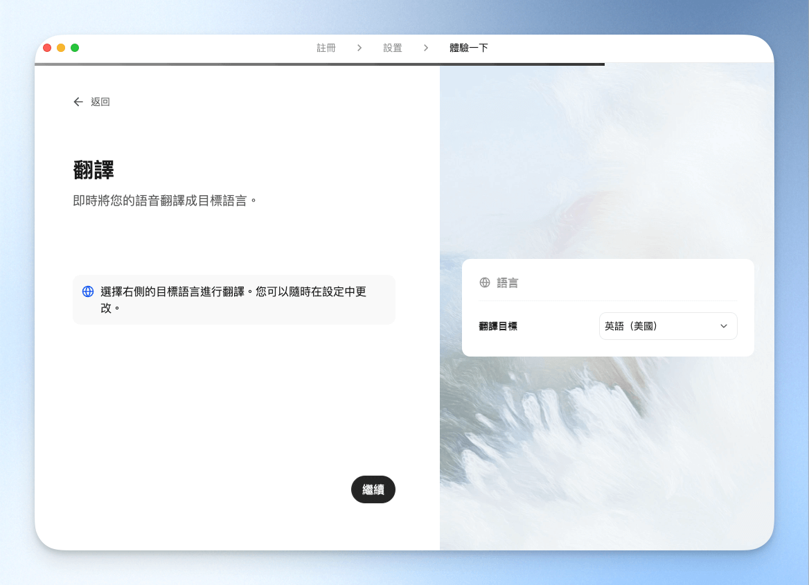 可以看到翻譯目標的初始設定是英語(美國),調整成繁體中文(台灣)。但是,如果你會使用到Typeless的翻譯功能的話,就調整成你的目標翻譯語言,不一定要設定繁體中文(台灣),比較重要的是下一步,一定要調整!