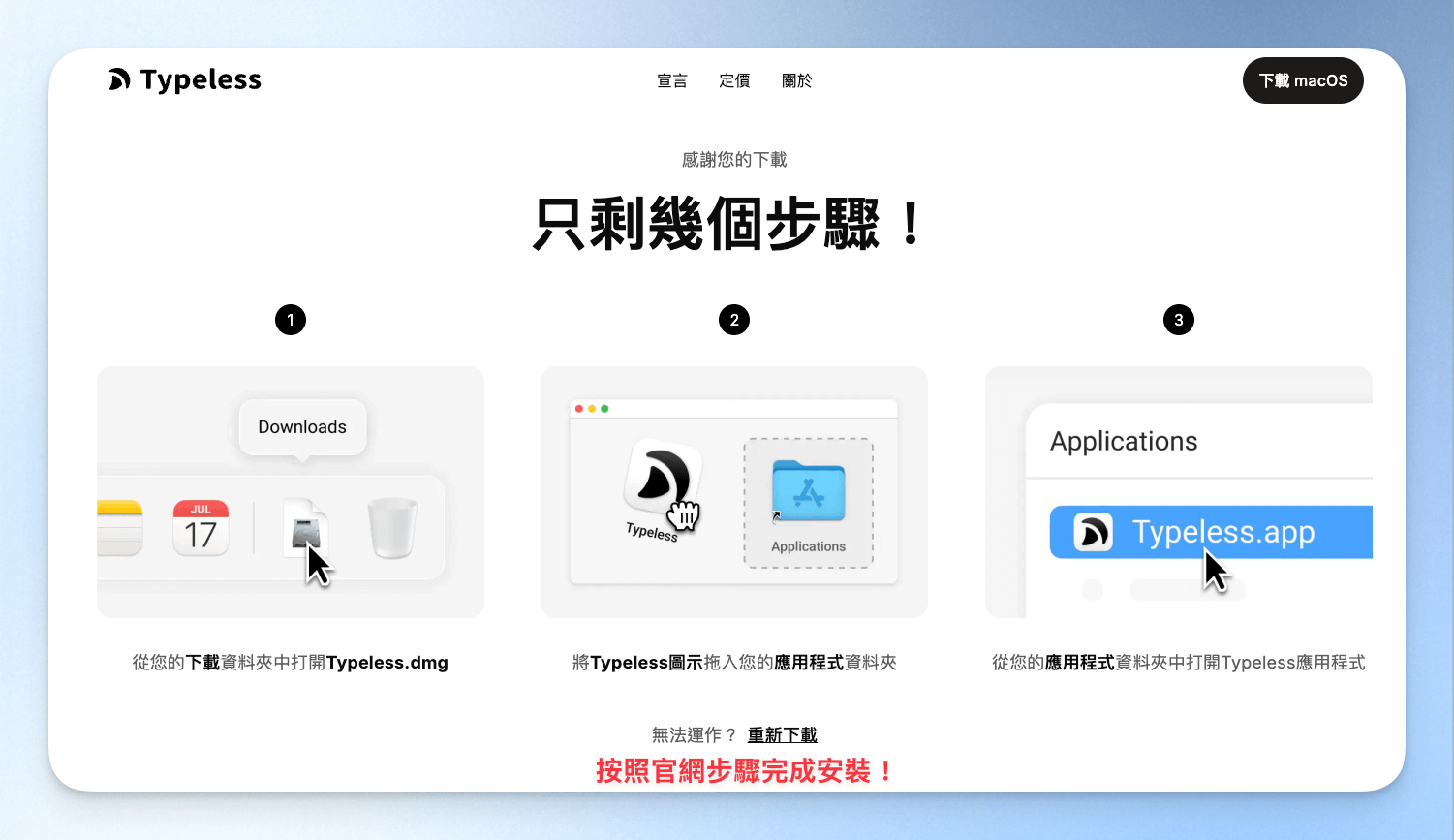 前往Typeless官方首頁,點擊右上角或中間的「下載Mac」按鈕。