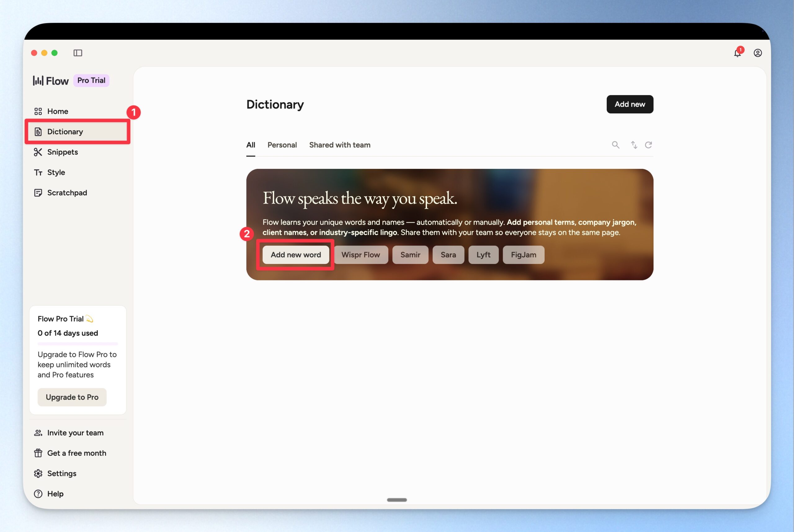 在 Wispr Flow 左方欄位點選 Dictionary,接著點選 Add New word 按鈕。