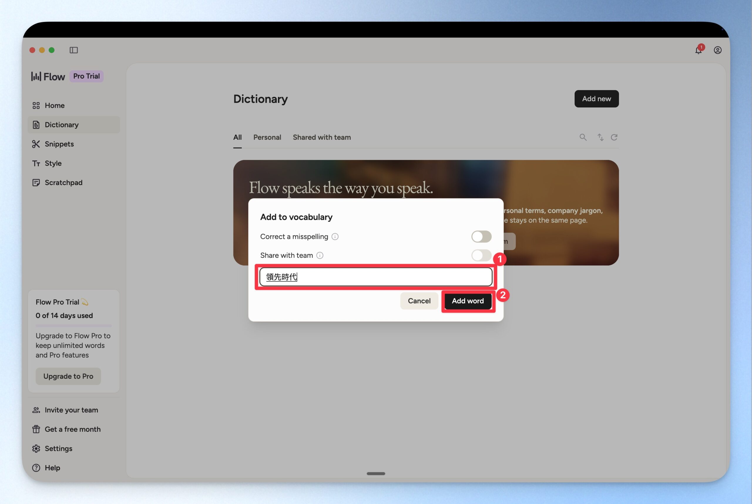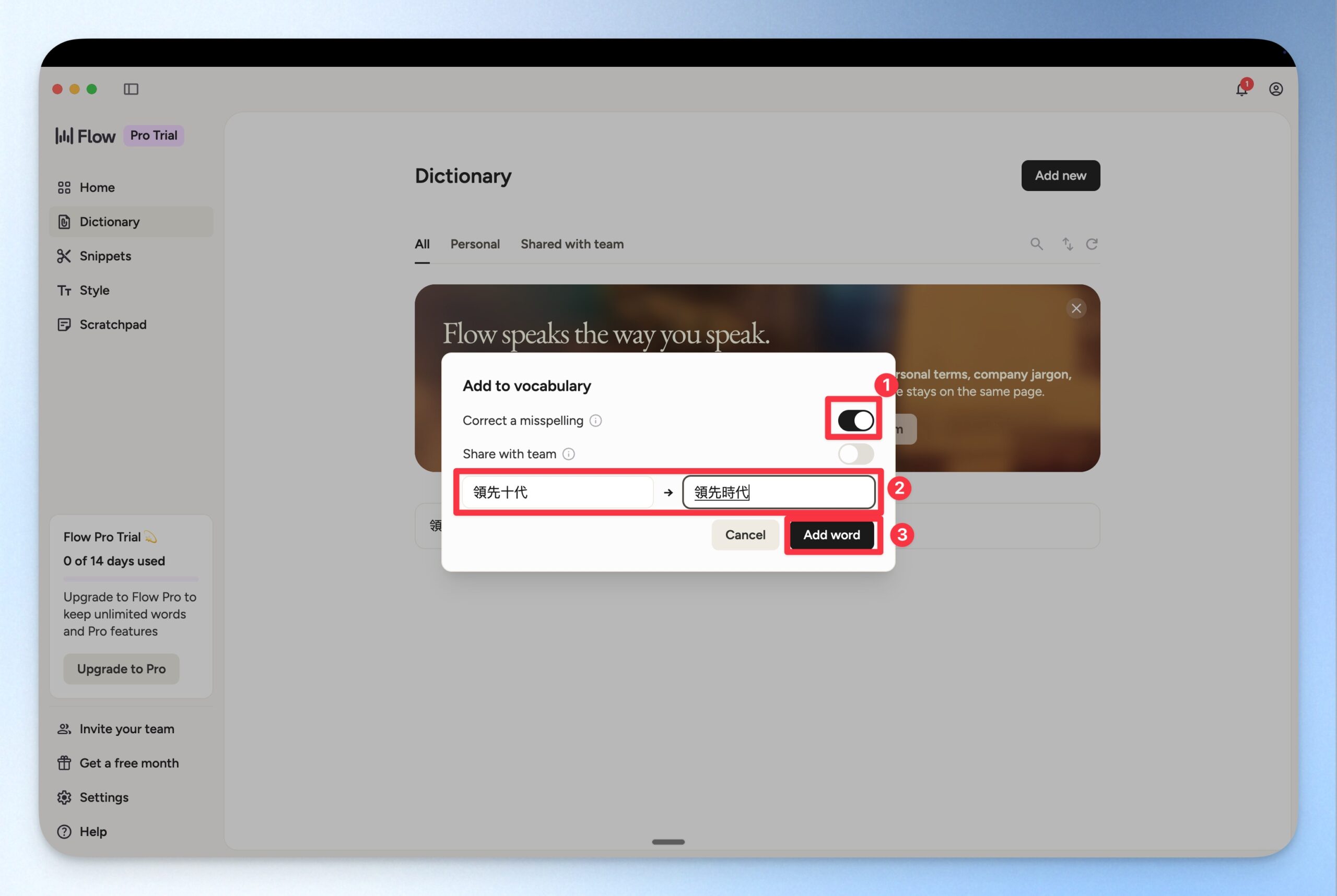 你也可以觀察 Wispr Flow 語音轉文字辨識錯誤的情境,並將該文字的正確寫法書入到字典裡面,降低 Wispr Flow 輸入錯誤的可能性。