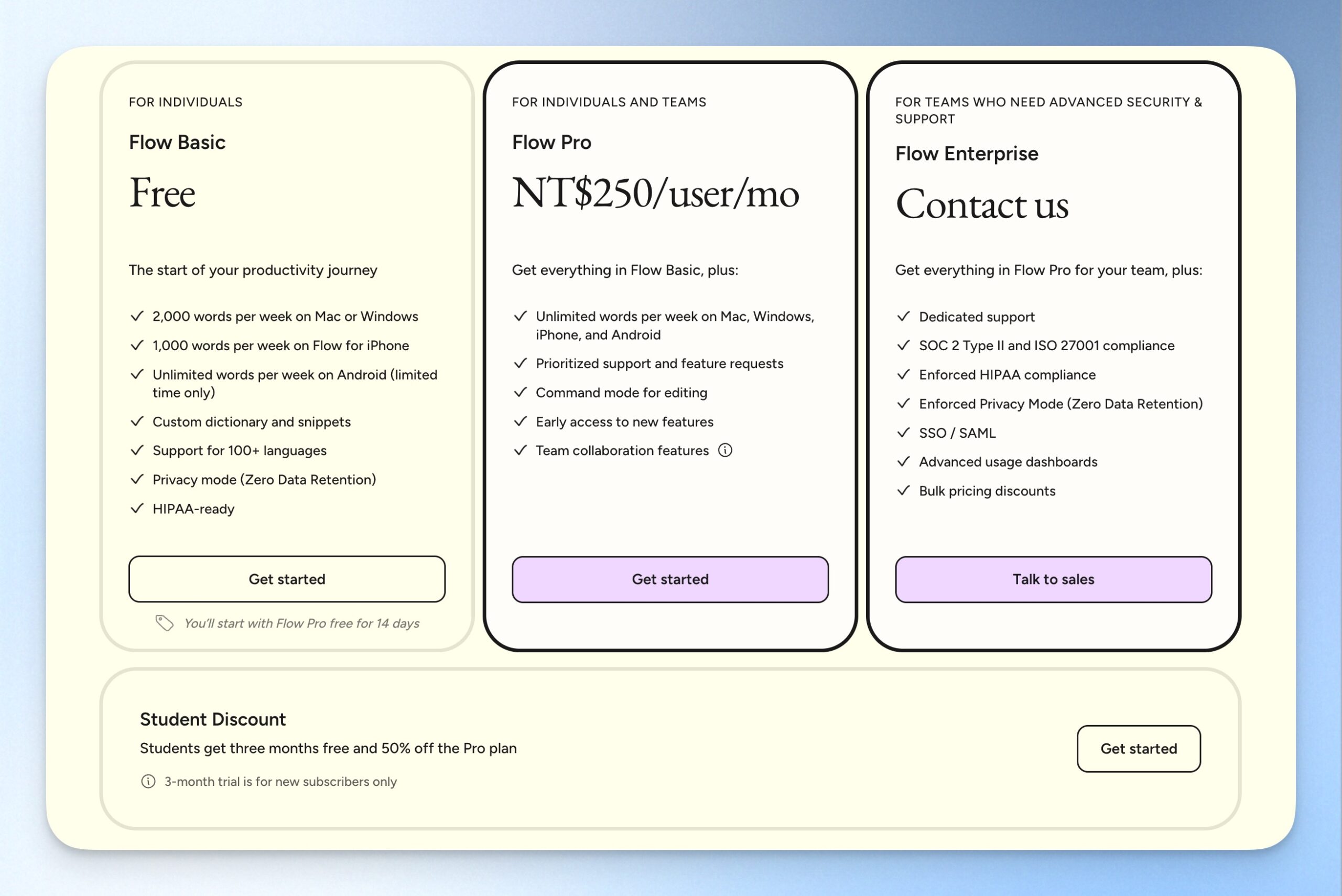 Wispr Flow 價格方案分成 Basic、Pro 和 Enterprise 版本,以個人使用來說,最大的差別在於「字數額度」。
