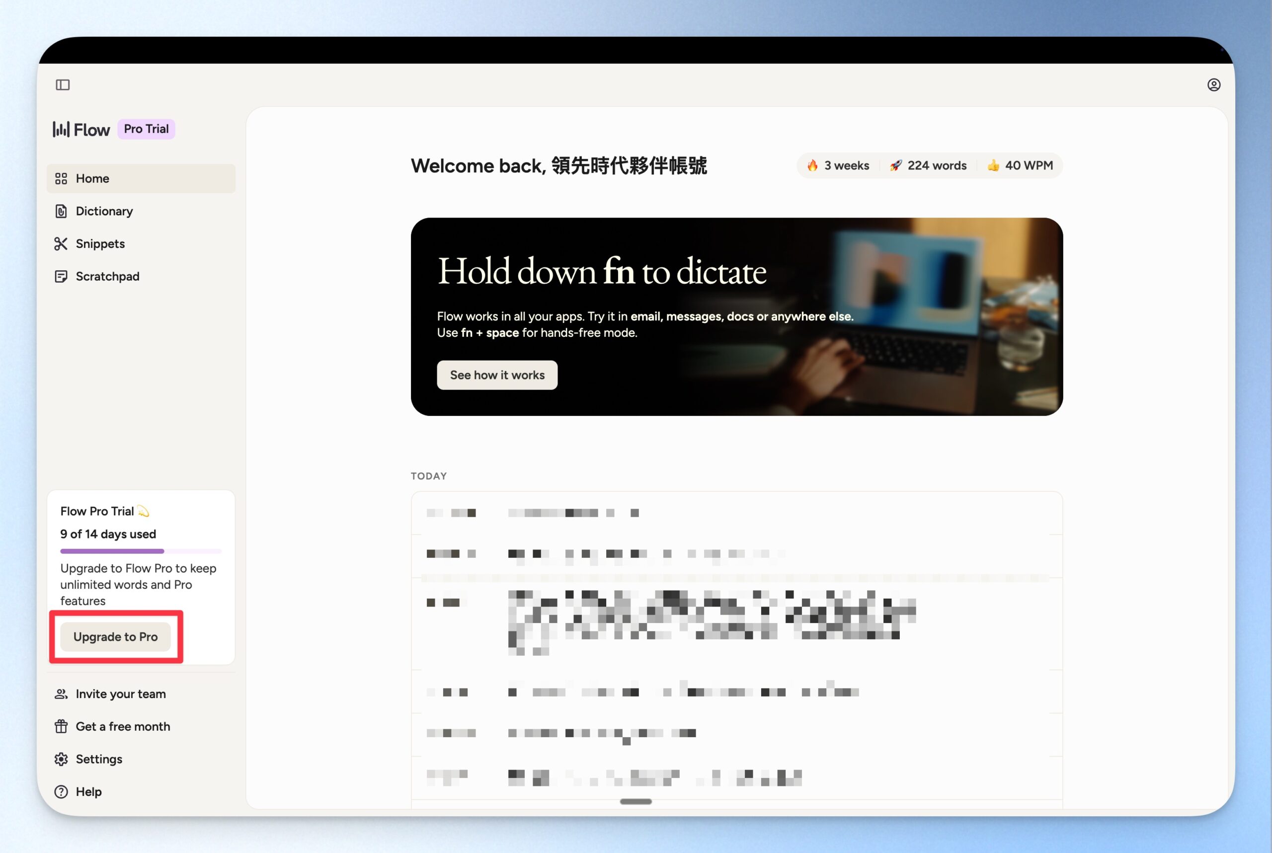 在 Wispr Flow 介面上,點選 Upgrade to Pro。