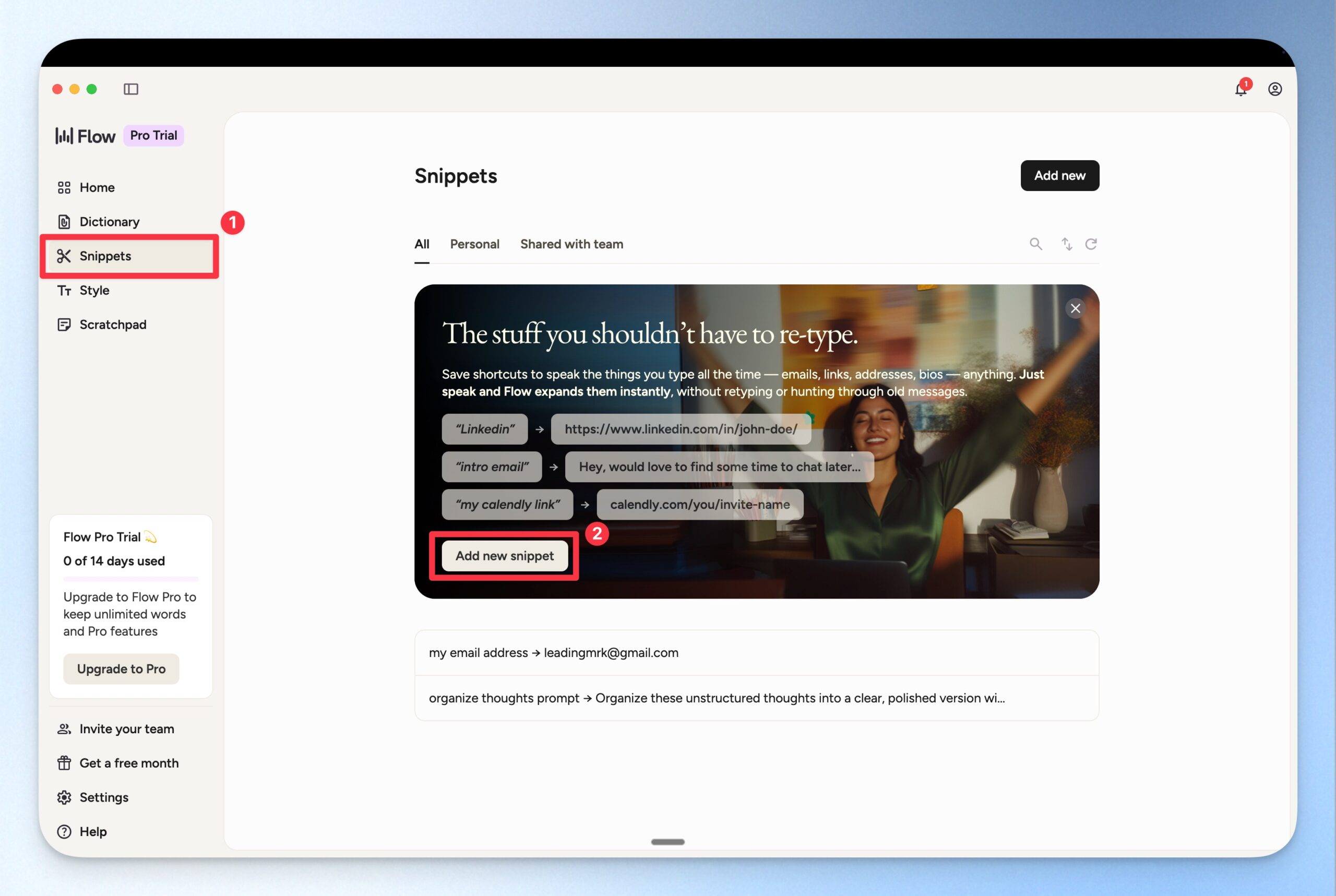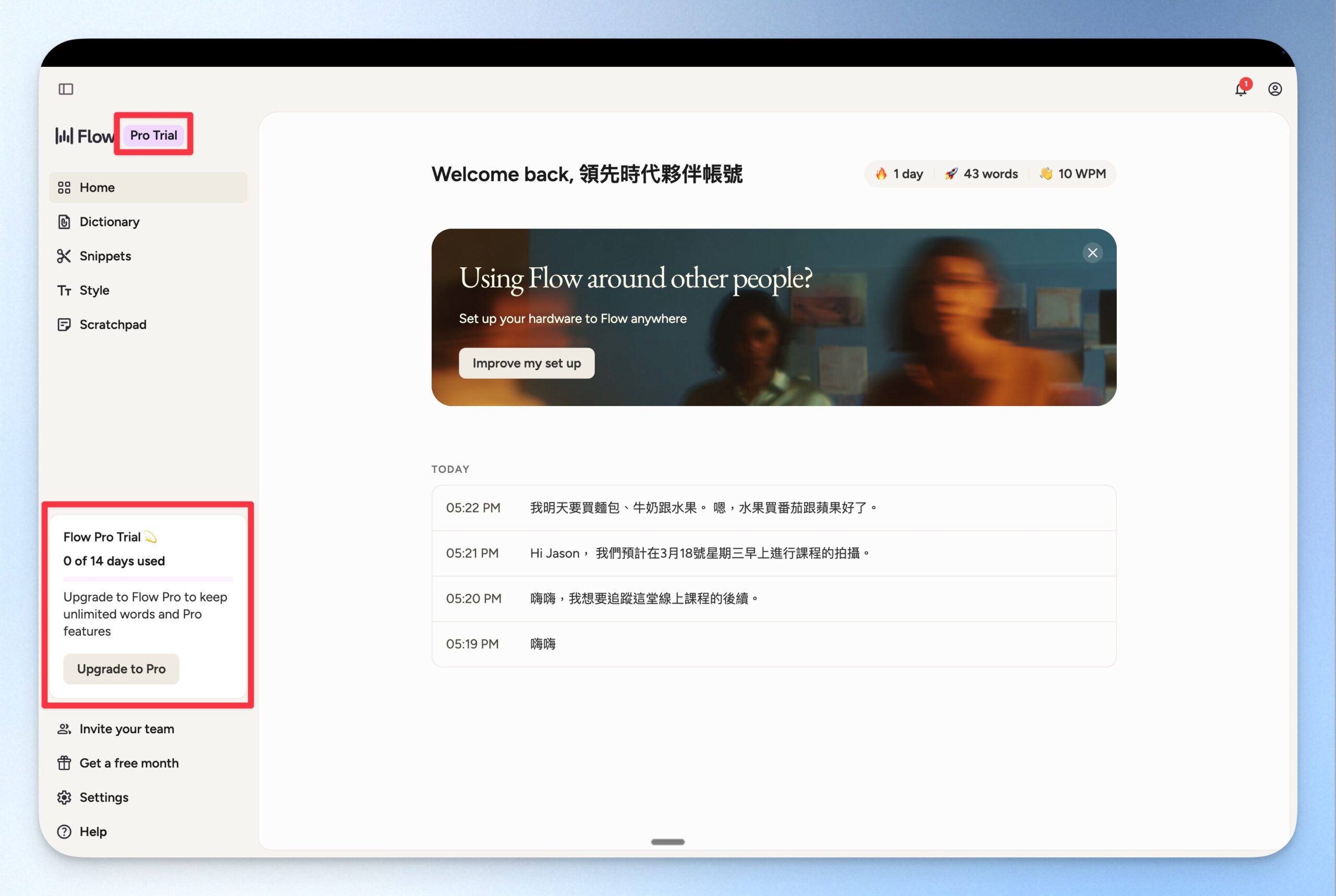 回答完問題後,Wispr Flow 就會直接進入 14 天免費 Pro 版的試用!