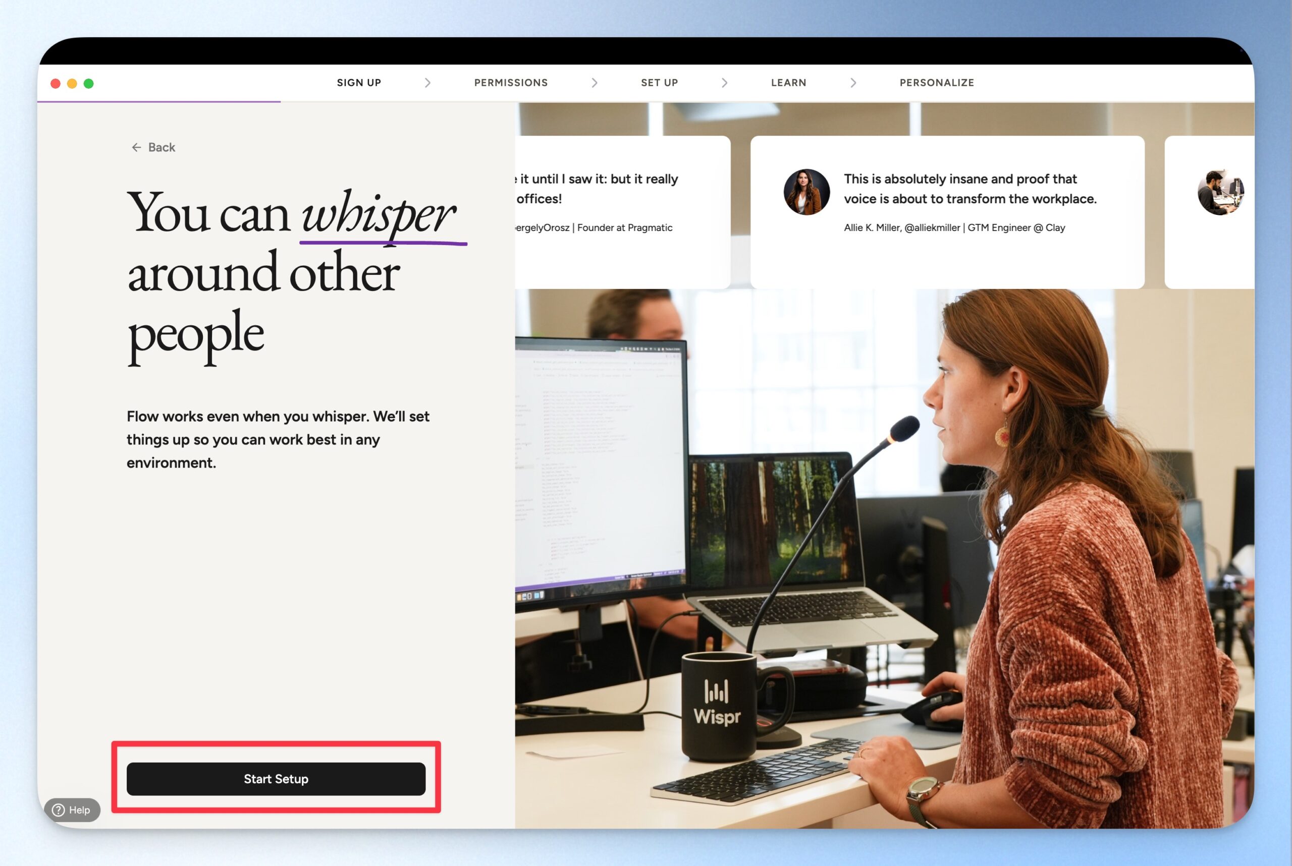 完成賬號註冊後,Wispr Flow 會自動進入 Start Setup 頁面,請點選 Start Setup 按鈕。