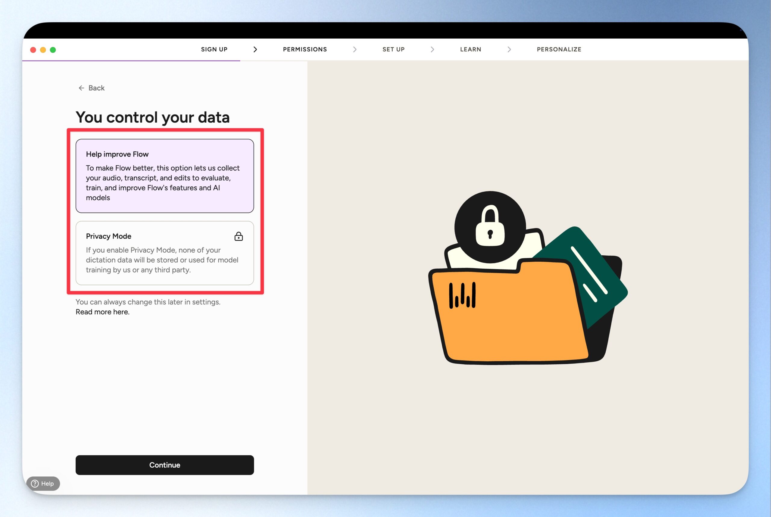 選擇資料隱私設定。如果你選擇 Help improve flow,你的資訊就會被 Wispr Flow 收集來優化模型;如果你選擇 Privacy mode,你的資訊就不會被 Wispr Flow 收集。這部分可以根據個人使用習慣來選擇即可。