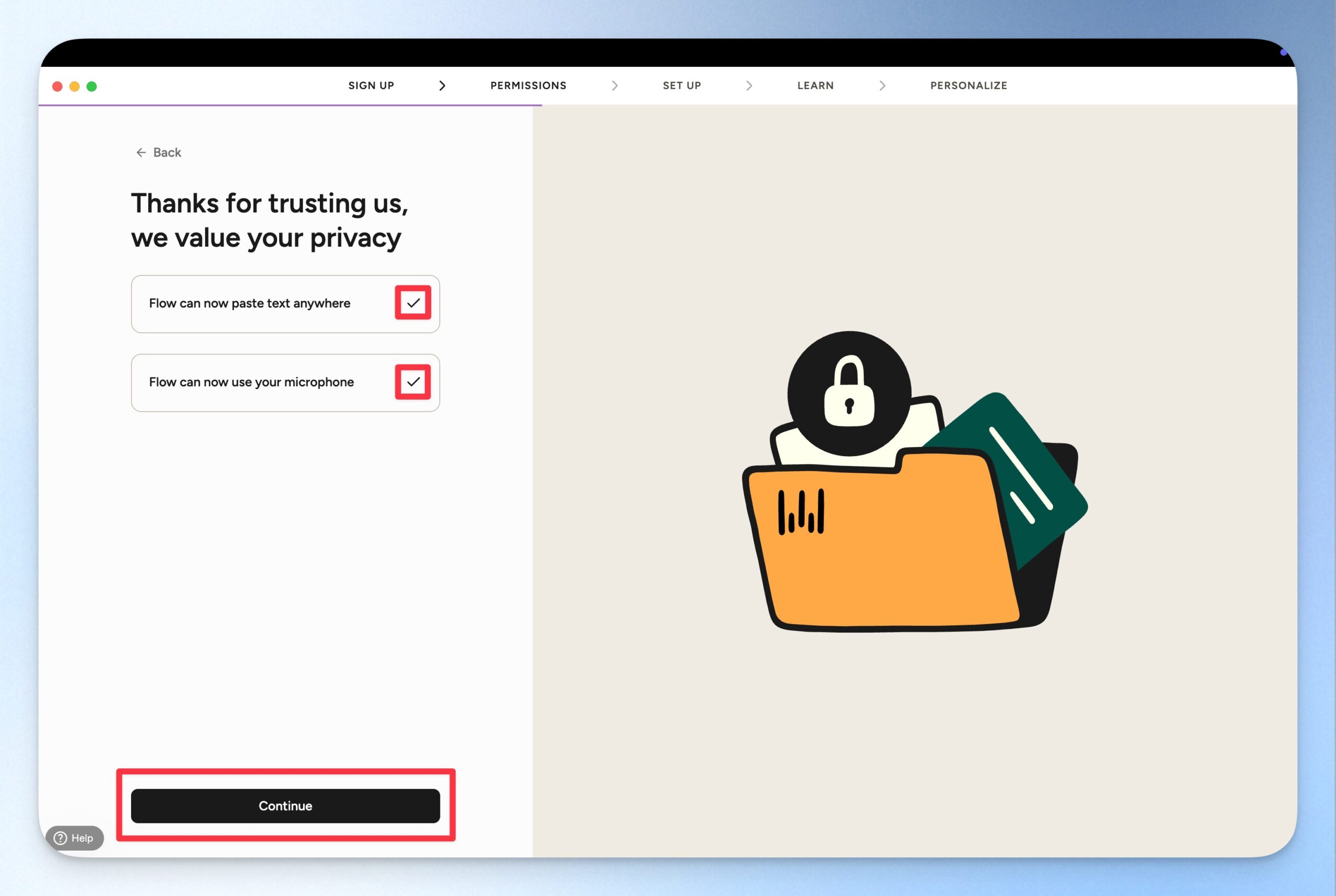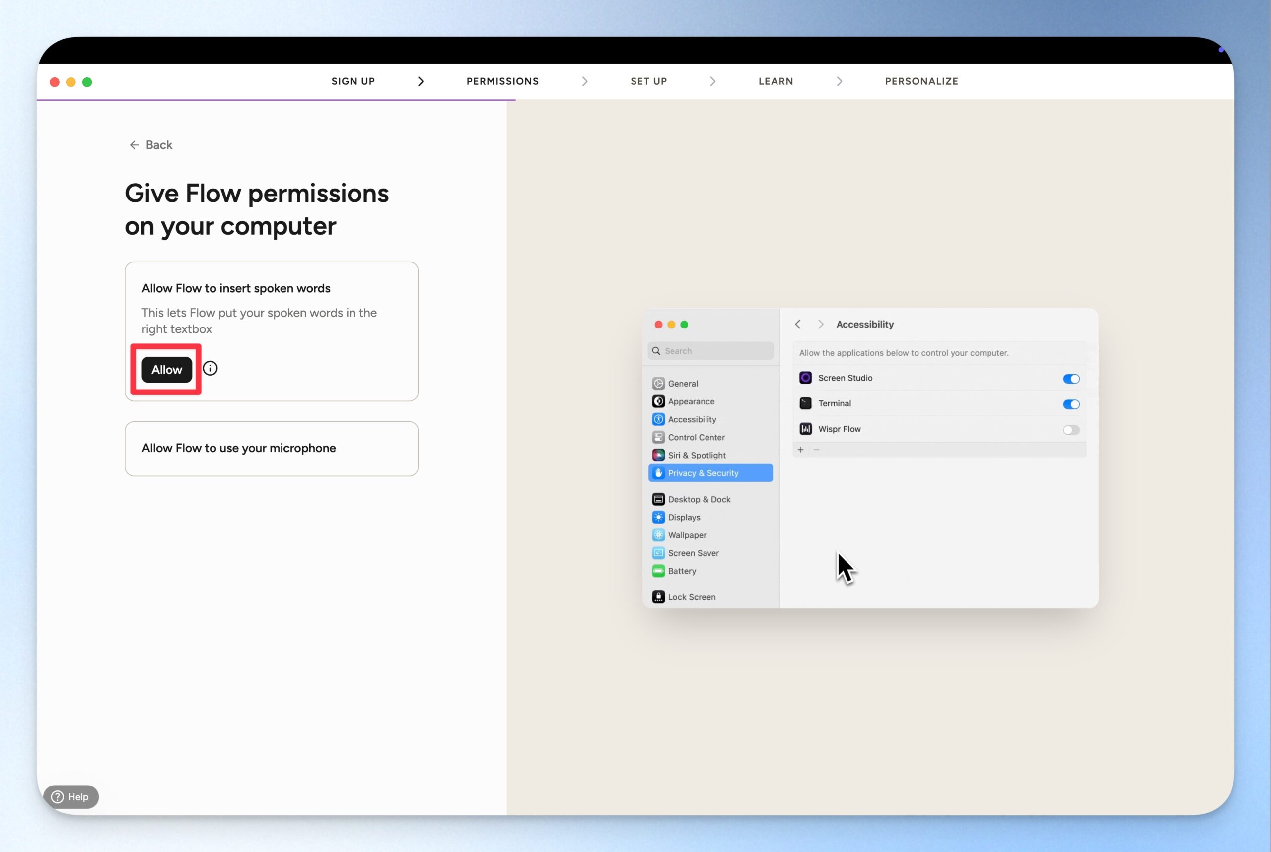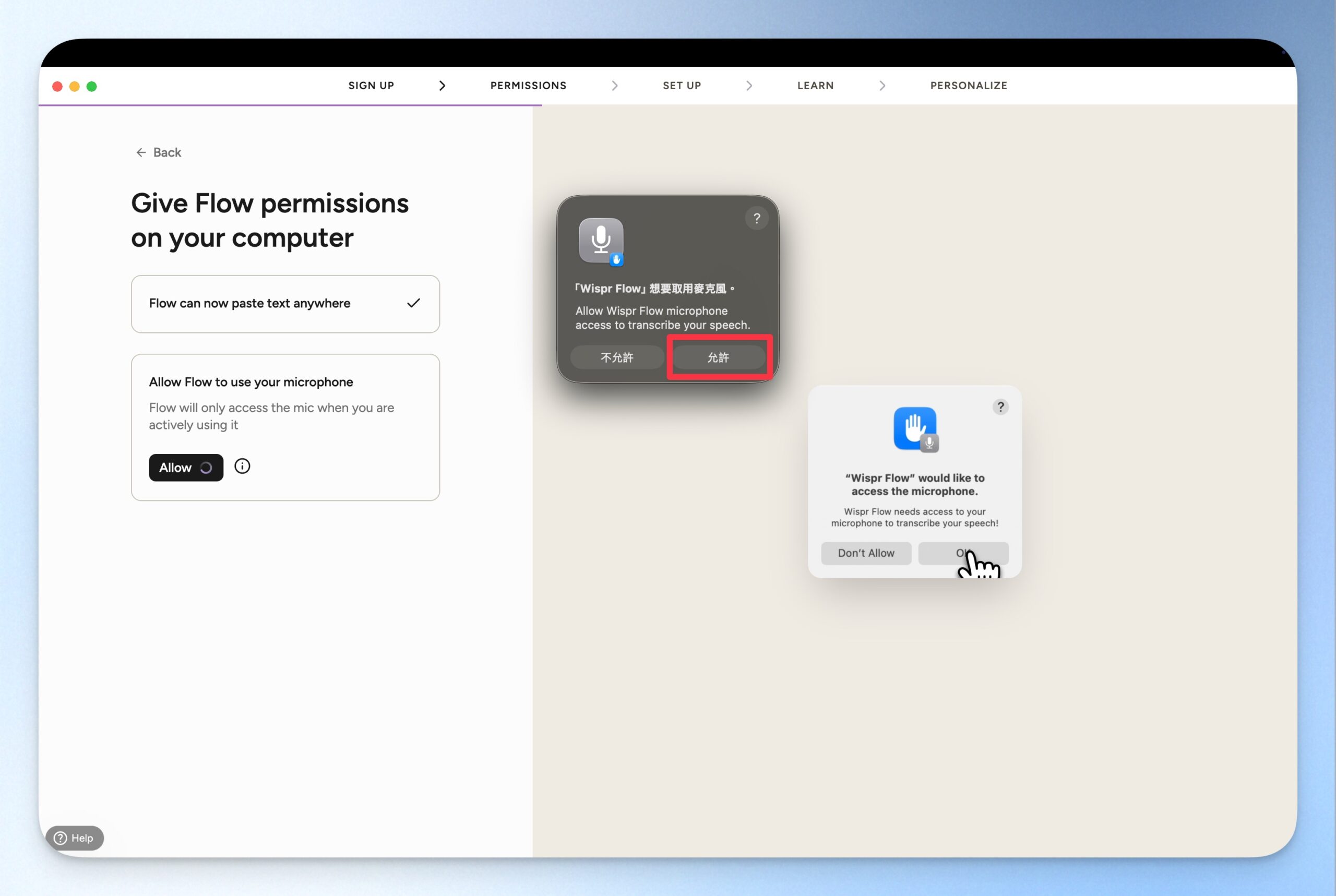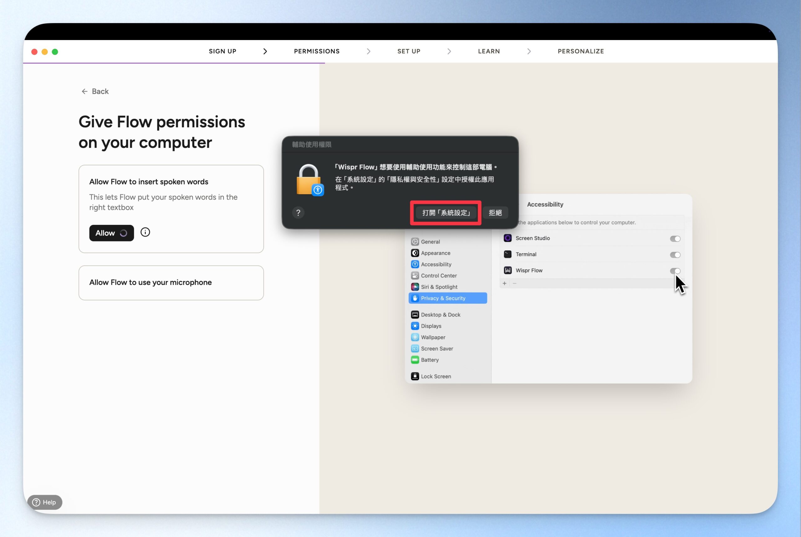 開啟電腦存取權。因為 Wispr Flow 需要能在各式各樣的生產力工具中直接用語音輸入,所以會需要有電腦的存取權。這部分跟著電腦的指示開啟即可。