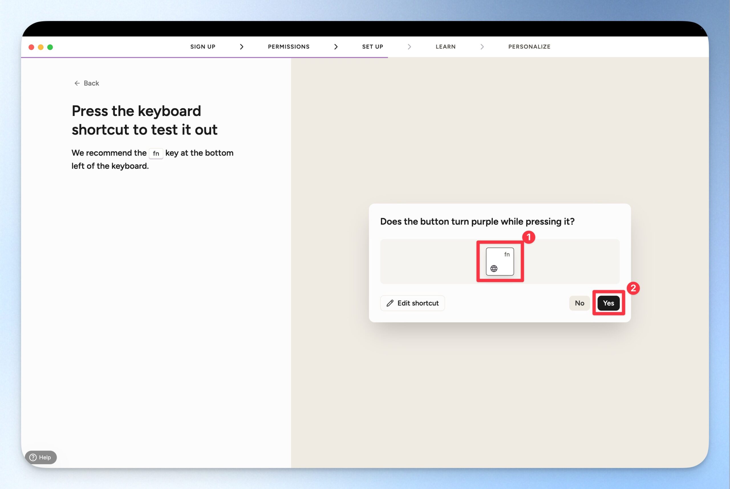 Wispr Flow 的鍵盤使用快捷鍵是 Fn 按鈕。你可以點選 Fn 按鈕確認畫面中的按鈕有沒有變紫色,如果有變紫色,代表這個快捷鍵有效,就可以點選「Yes」前往下一步。
