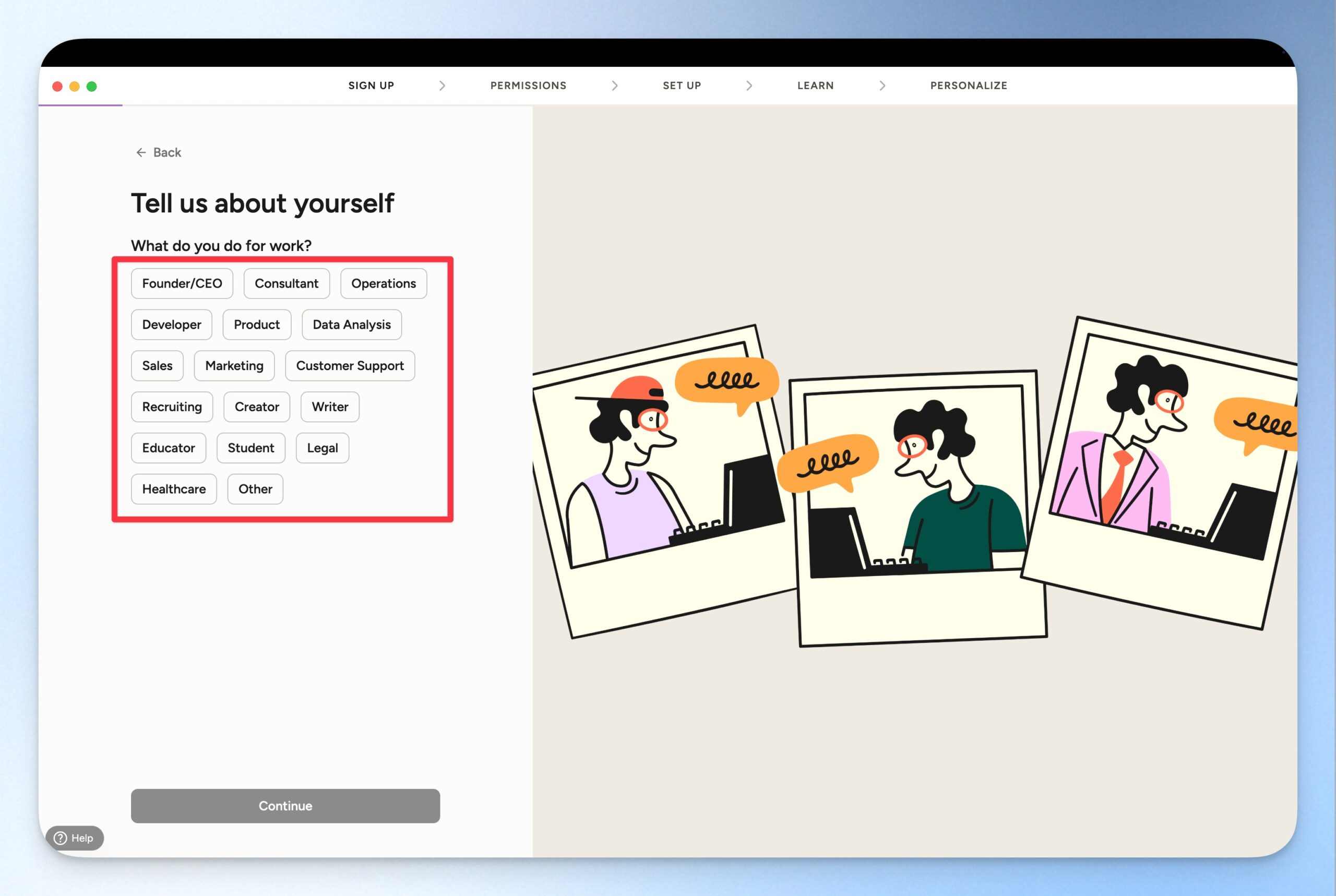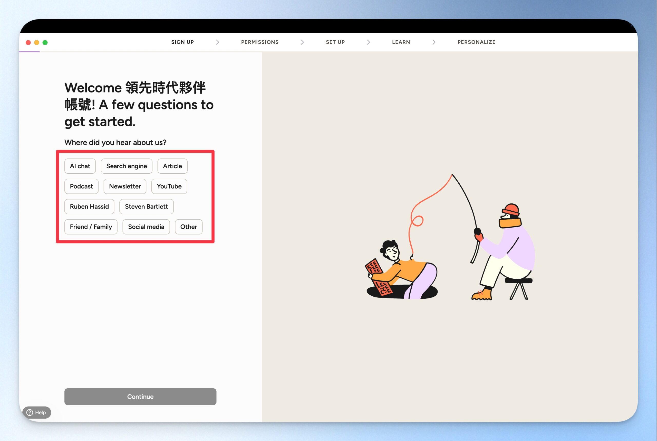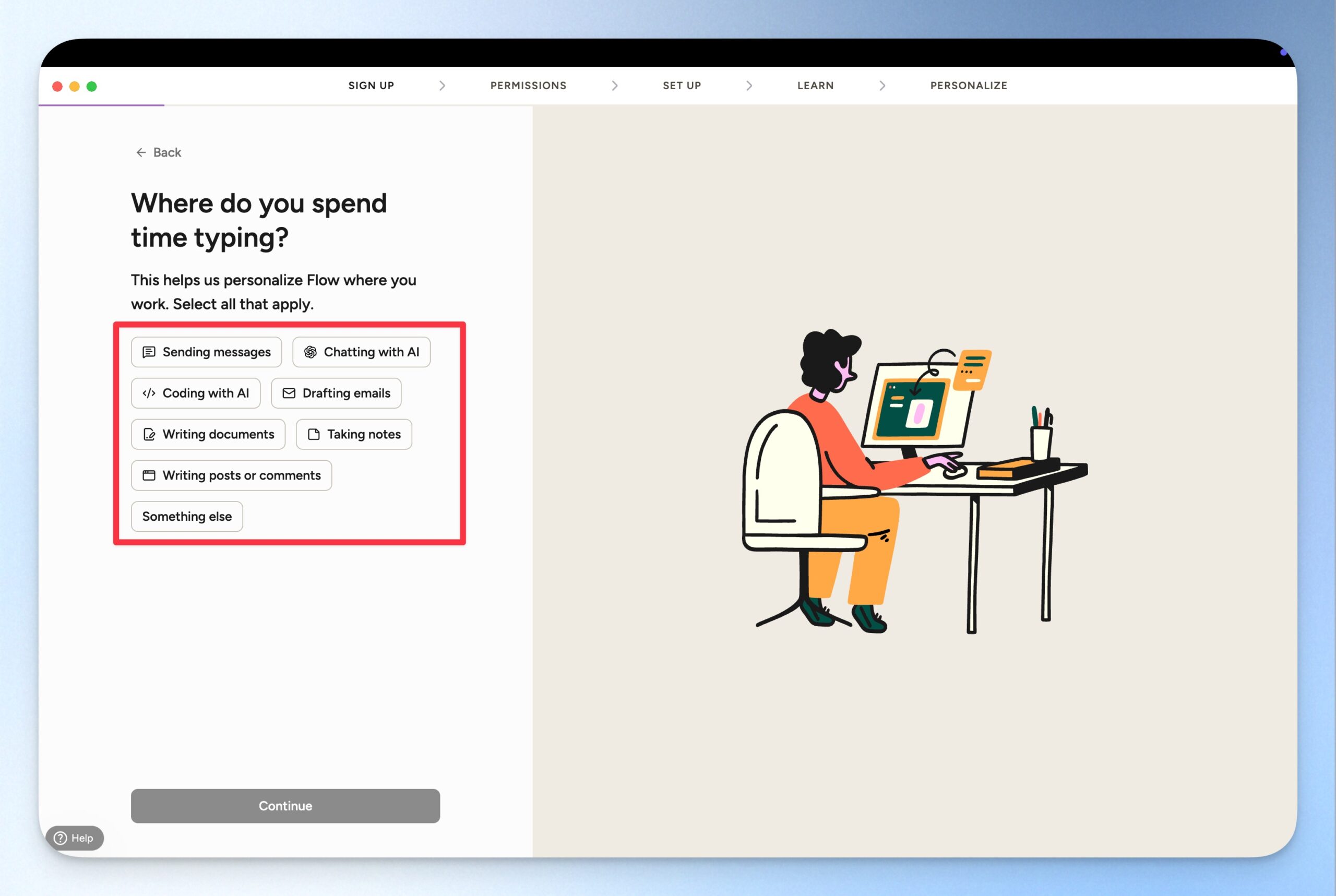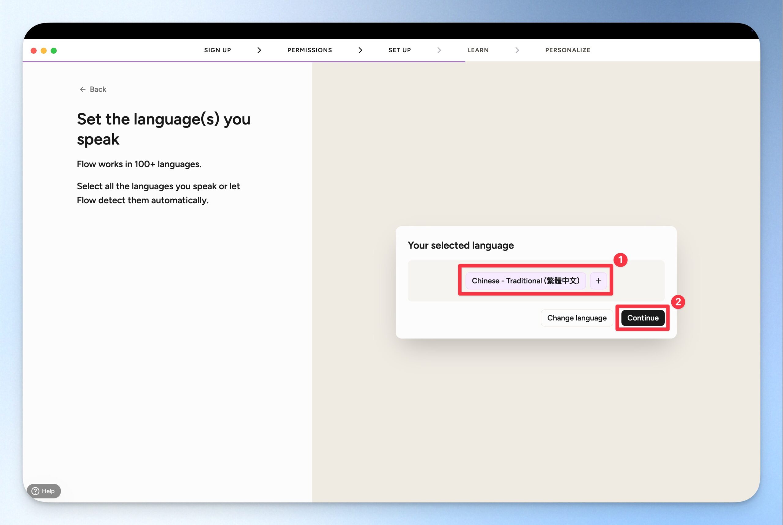 Wispr Flow 支援 100 種以上的語言辨識,但你可以在這裡先設定你主要使用的語言。設定完成後,可以點選「Continue」前往下一步。