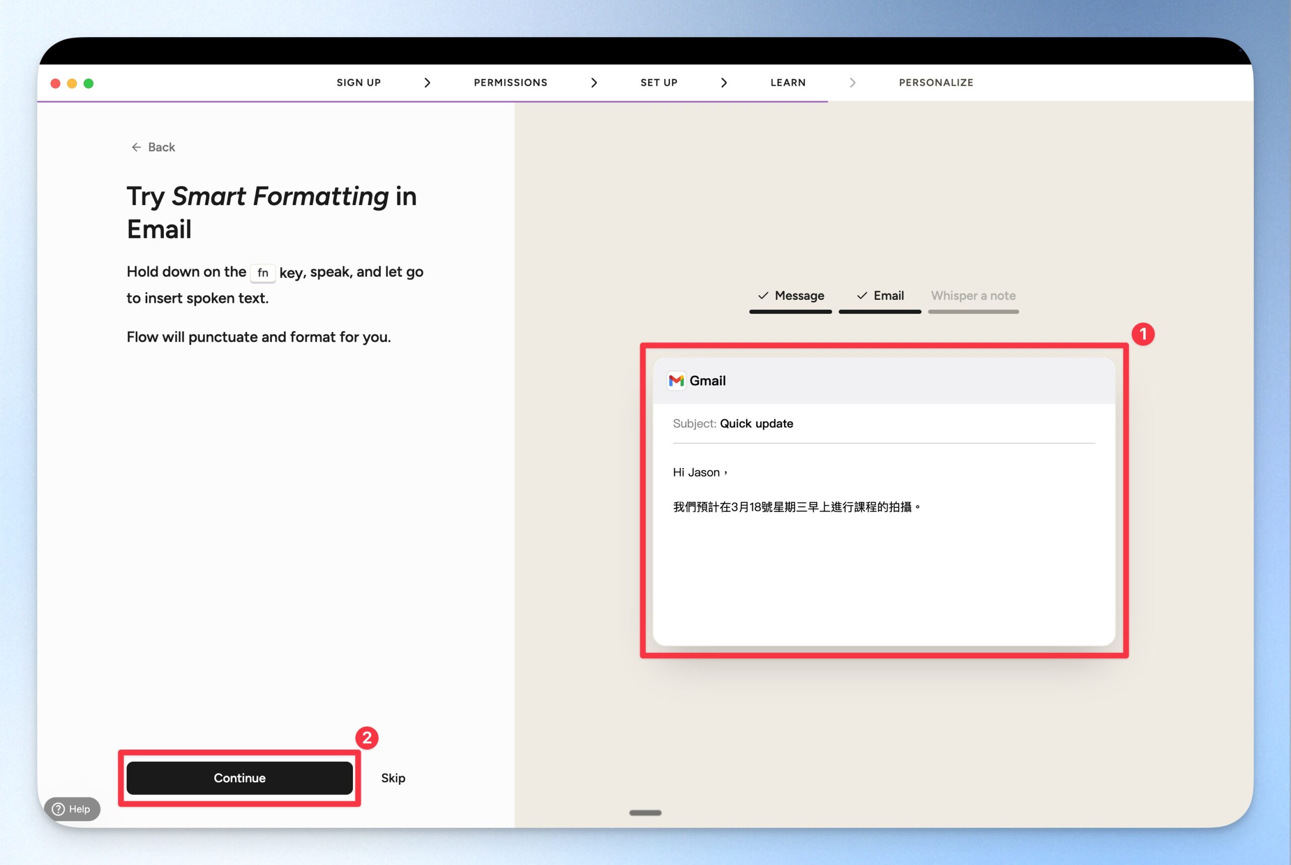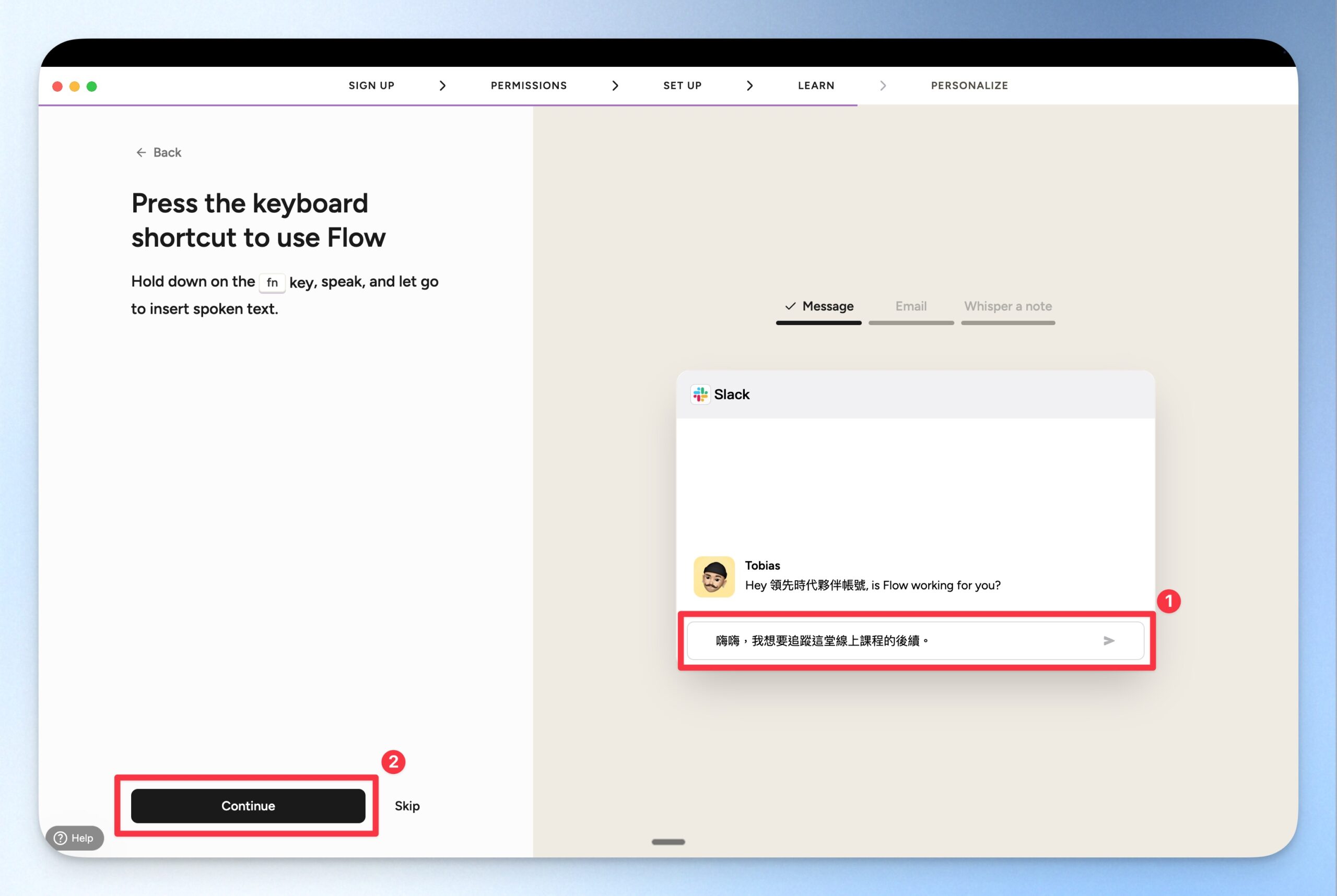 接下來會進入簡單的教學環節,你可以按住 Fn 按鈕開始嘗試由語音轉文字進行輸入。Wispr Flow 的教學環節設定了「訊息輸入」、「E-mail 輸入」以及「小聲說話輸入測試」。在測試過程中,你可以看到 Wispr Flow 根據輸入軟體的不同,而微調文字輸出的嚴謹程度。例如,在 Slack 的訊息就比較輕鬆,在 E-mail 則有遵守 E-mail 基本格式。