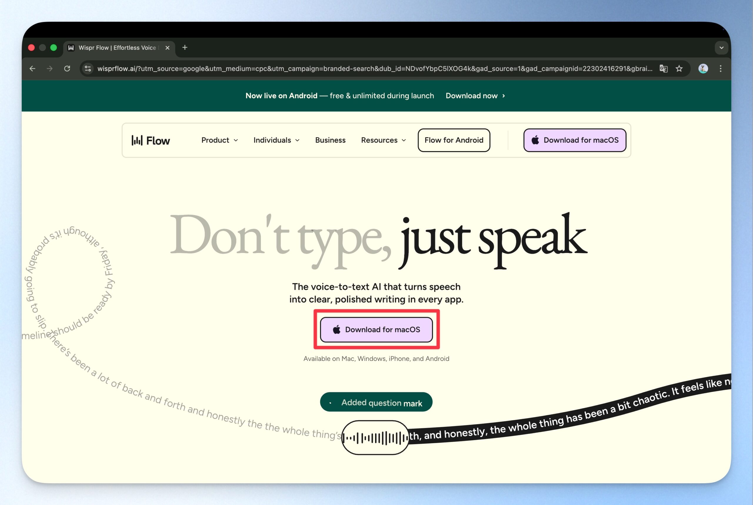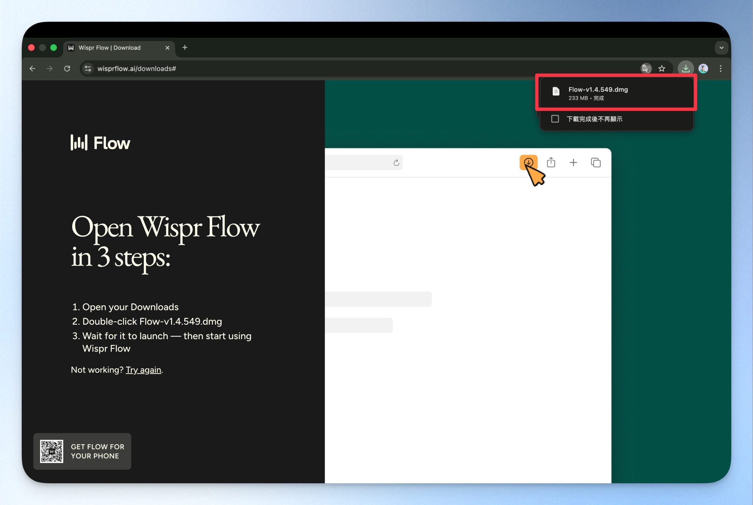 開啟 Wispr Flow 官方網站,Wispr Flow 會自動偵測你的裝置類型,並直接提供你推薦下載的版本。