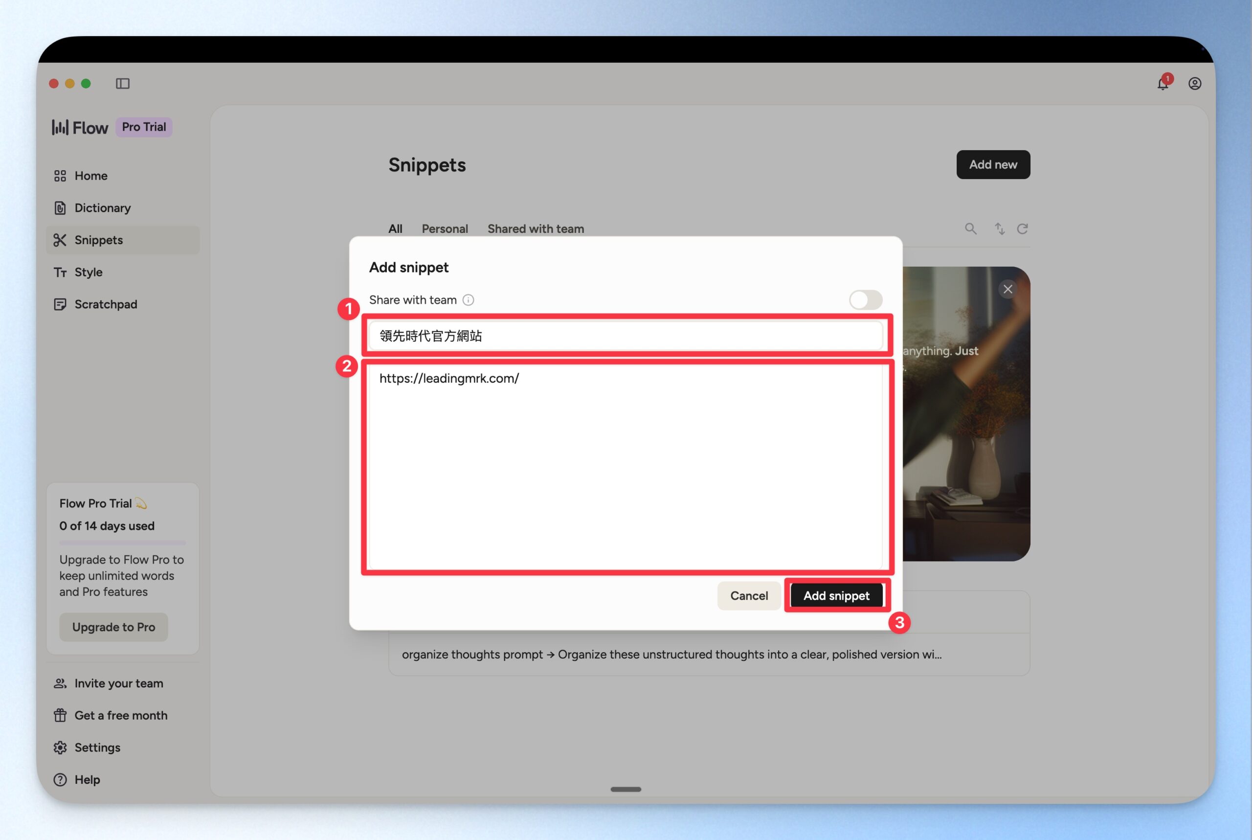 在第一個欄位輸入你想要觸發 Wispr Flow 的片語,並在第二個欄位輸入該片語指涉的內容,再點選 Add Snippet 按鈕就設定完成囉。