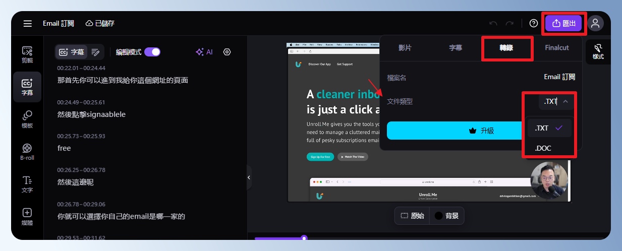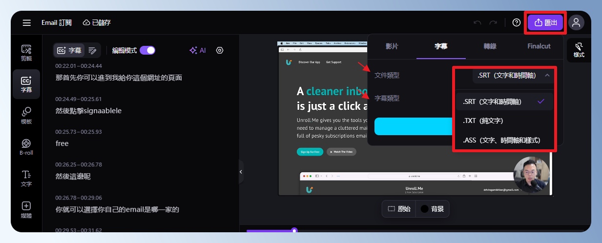Zeemo 的字幕匯出格式有支援 SRT、TXT 與 ASS 檔,需付費訂閱才能使用字幕匯出功能。點選右上角的「匯出」按鈕,切換到「字幕」區域,即可設定匯出格式並進行下載。