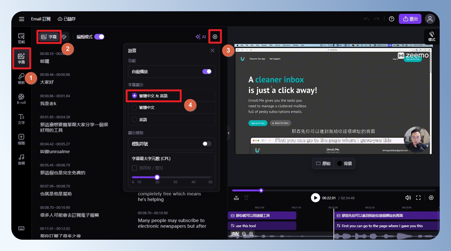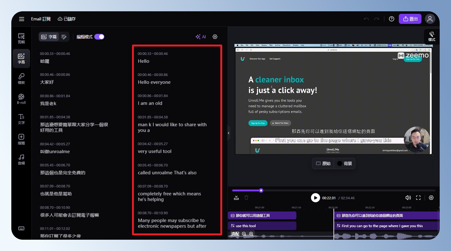字幕生成完成時,或在左側同時顯示繁體中文與英文字幕,可直接於編輯畫面中修改文字。