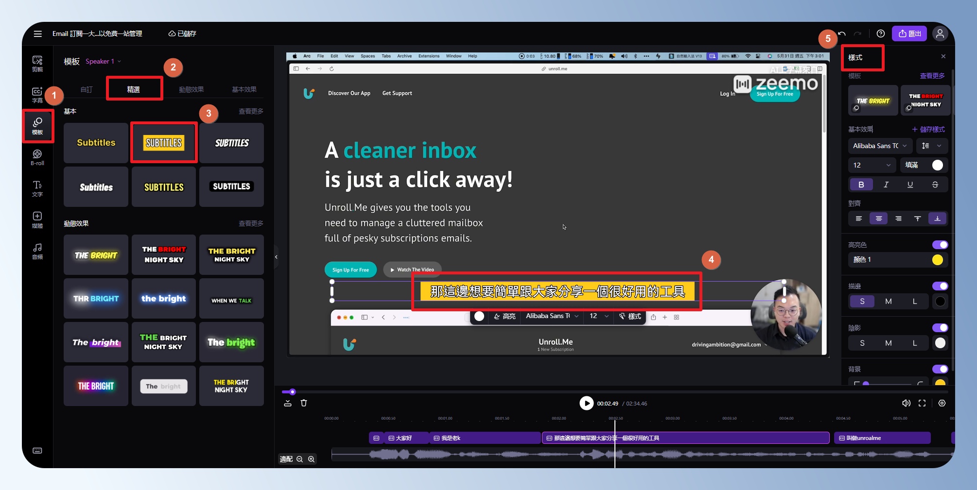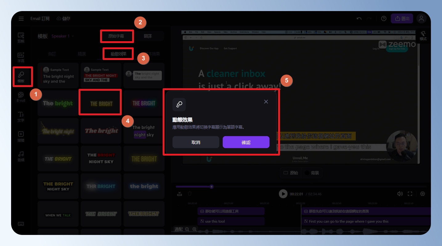 Zeemo 有提供很多內建模板,除了基本的樣式之外,還有動態效果,可以讓影片呈現活潑有趣的感覺。如果想修改字幕樣式,可以切換到左選單的「模板」,直接點選想套用的樣式,或是在右側修改文字樣式,完成後就可以直接預覽。