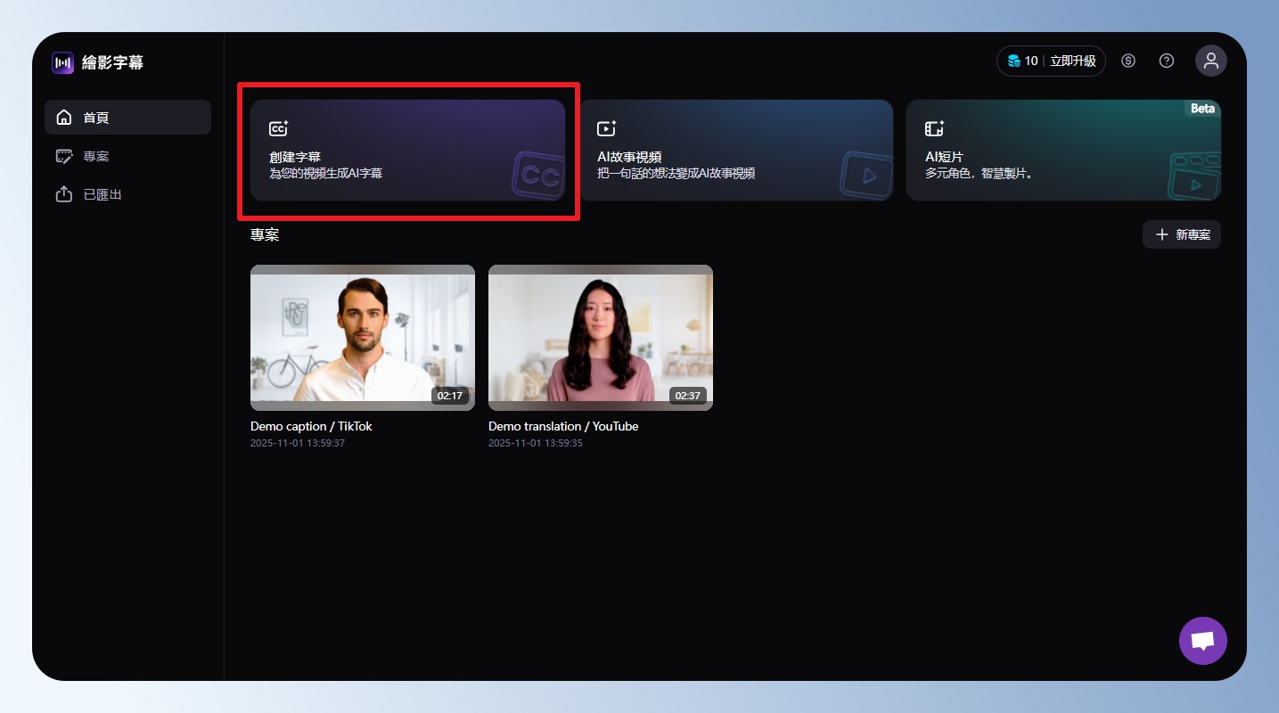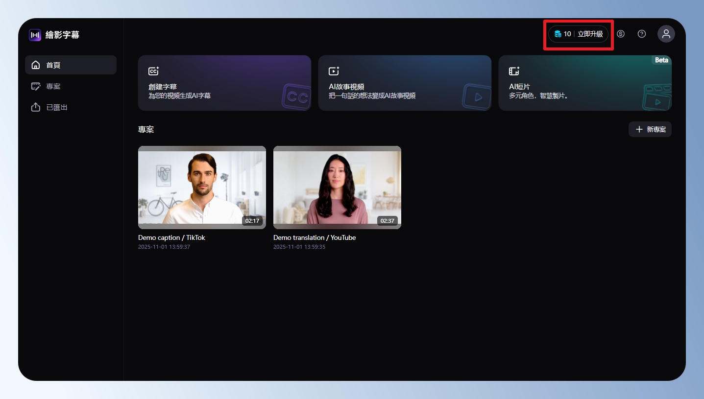 - 免費方案限制多:免費帳號僅有 10 點積分,使用字幕功能會消耗點數, 10 點只能處理 5 分鐘左右的影片,匯出影片會含有浮水印。