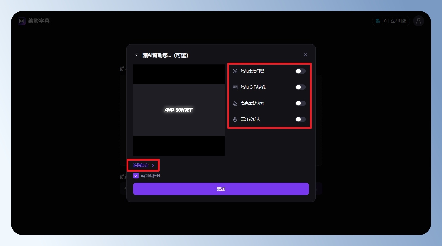 設定是否要添加表情符號、GIF 貼紙、高量重點內容或區分說話人。如果想設定字幕最大顯示字數,可以點下方的「進階設定」。