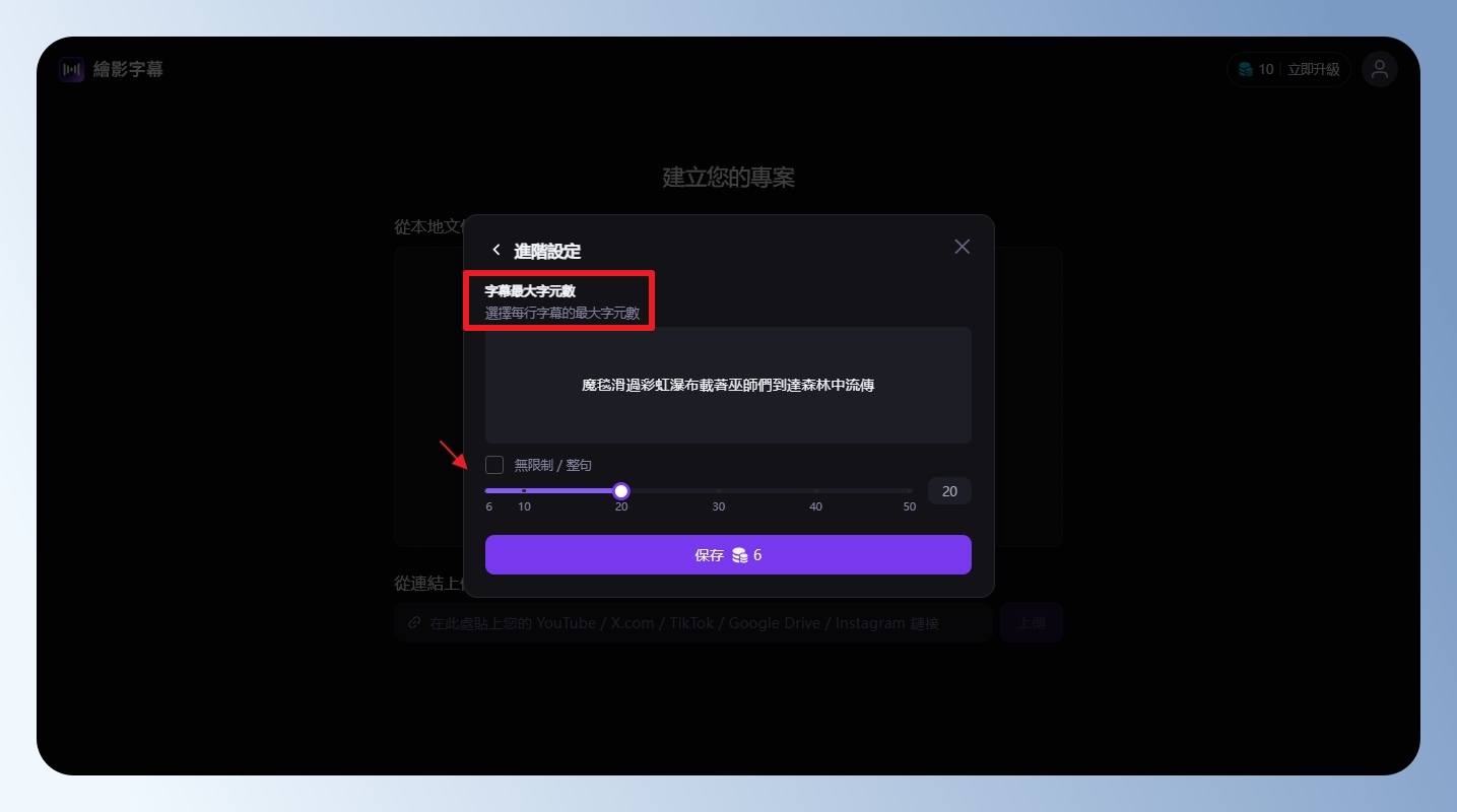 可設定字幕字數為 6~ 50 個字,如果沒有硬性規定或想要呈現整句話,可以勾選「無限制 / 整句」的選項。補充一下,這邊的字數我設為 20 個字,但 Zeemo 不一定會把每句話都塞滿 20 個字,還是會根據主講人的語氣還有節奏去做斷句。