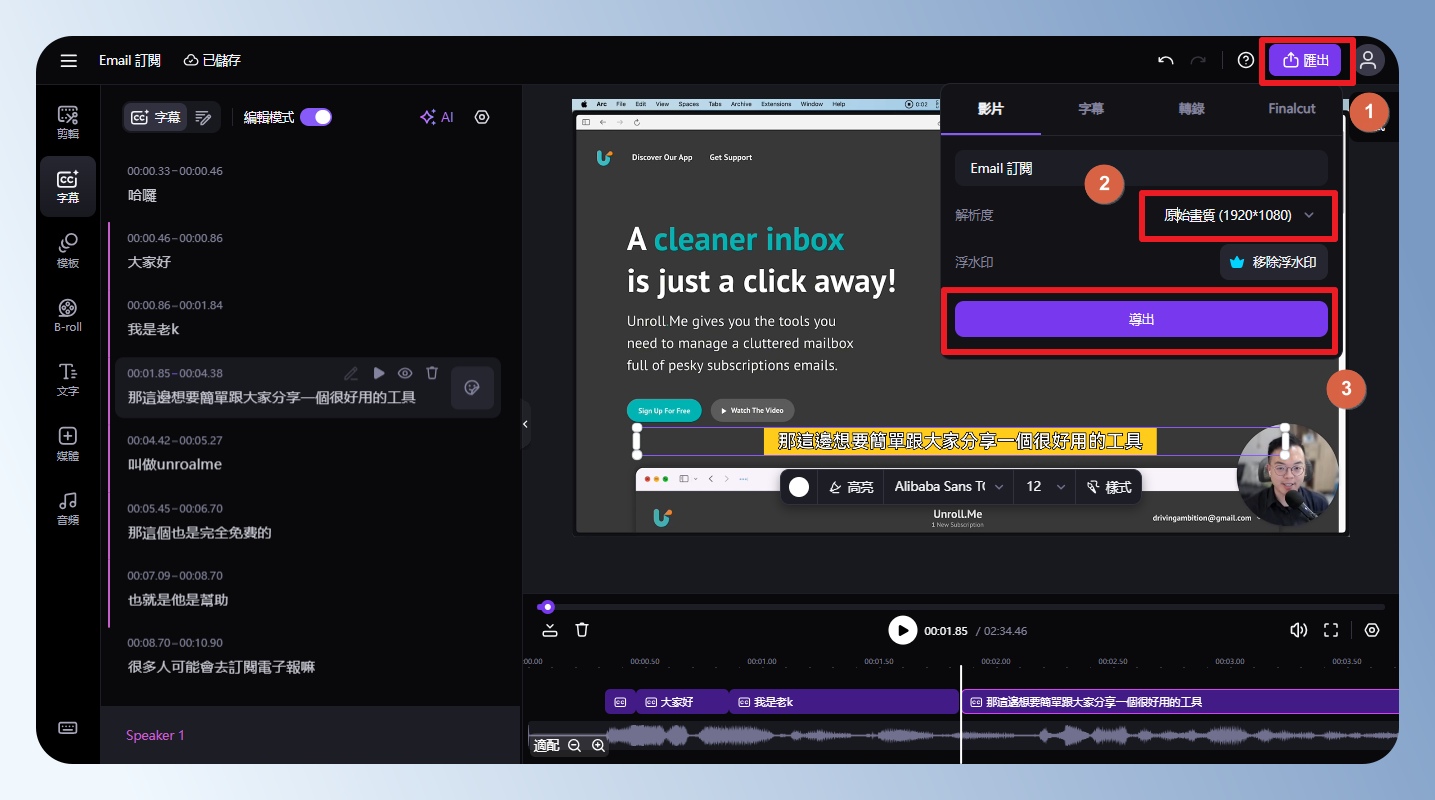 編輯完成後,可以點選右上角的「匯出」按鈕,選擇解析度之後,按「導出」就能匯出影片。