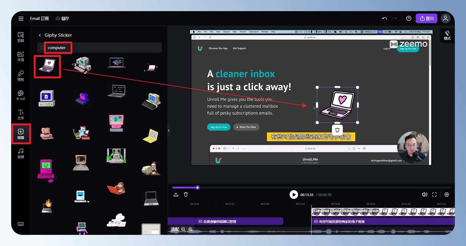 Zeemo 不只幫你加字幕,還整合了影片編輯功能。像是:加入動態效果、增加 B-roll 素材。讓你減少來回切換多款軟體的次數,直接在 Zeemo 裡完成「上字幕+特效」的編輯。