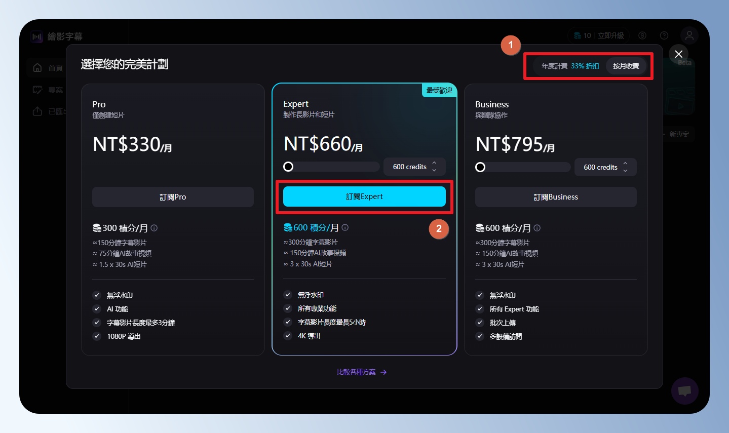 - Expert 方案:如果你需要編輯長影片,或有線上課程影片,需要高畫質、長時間影片支援、多語版字幕 → 建議升級使用 Expert 方案。